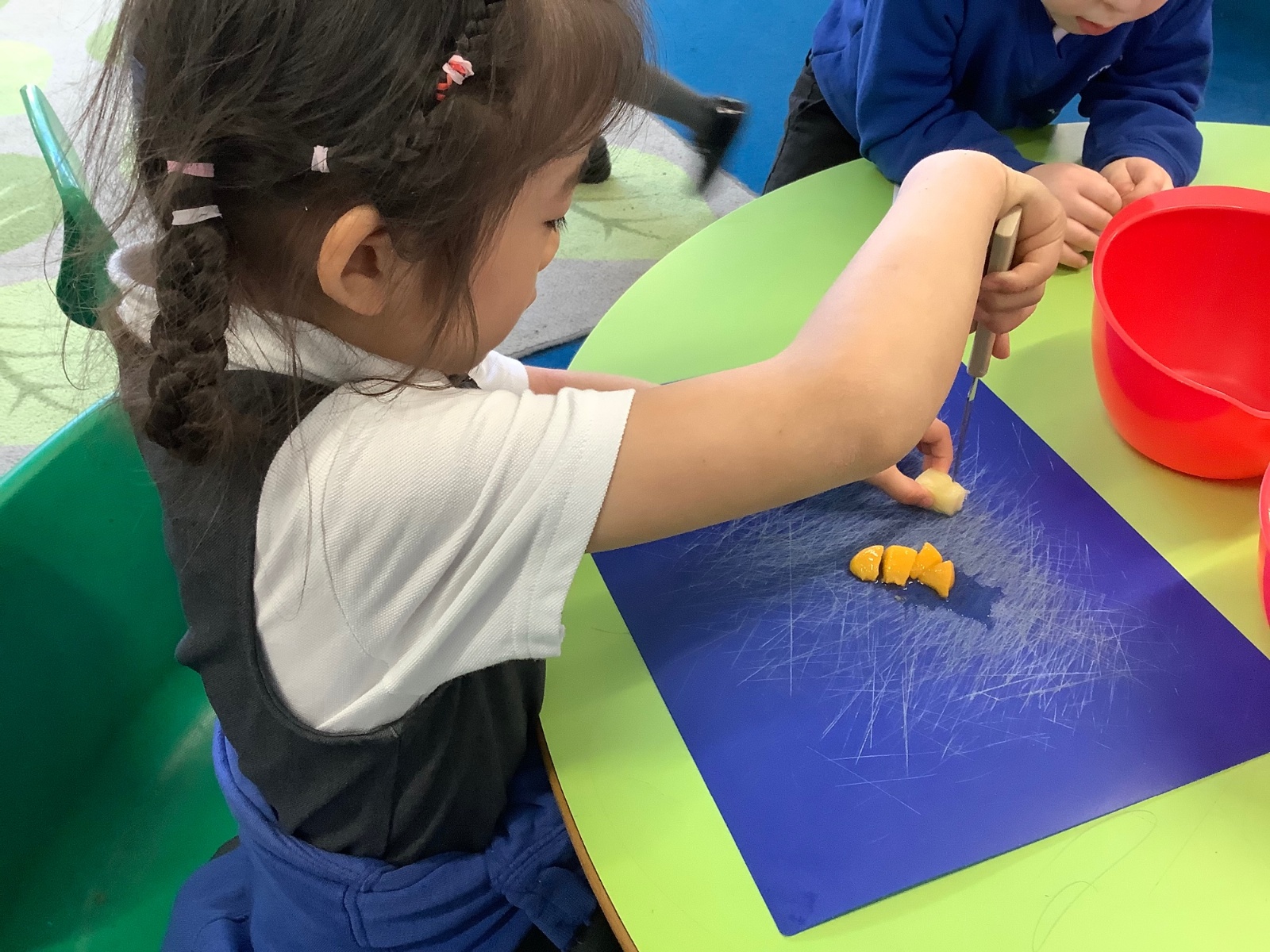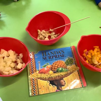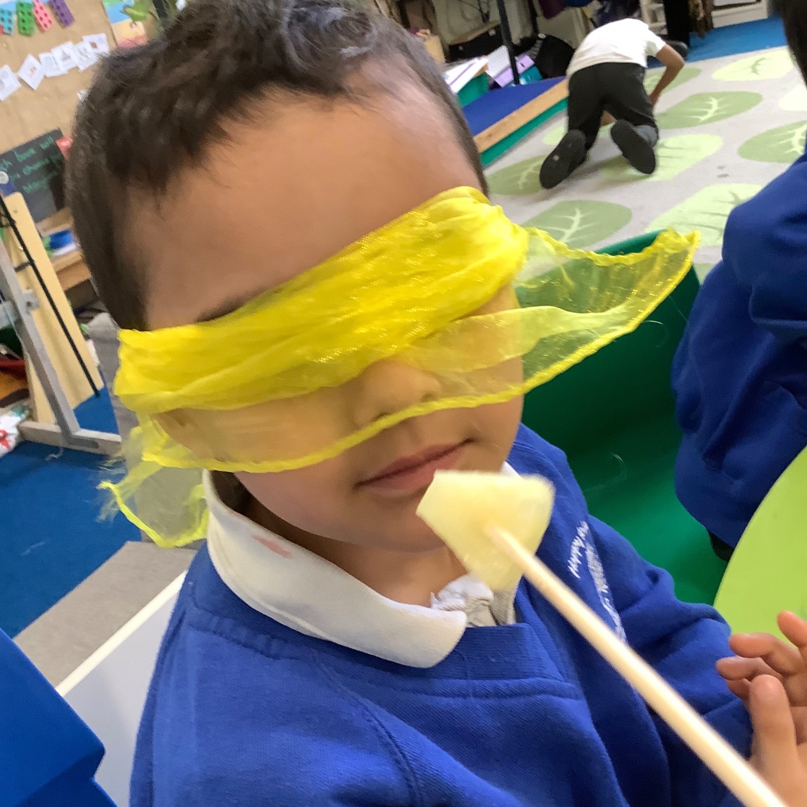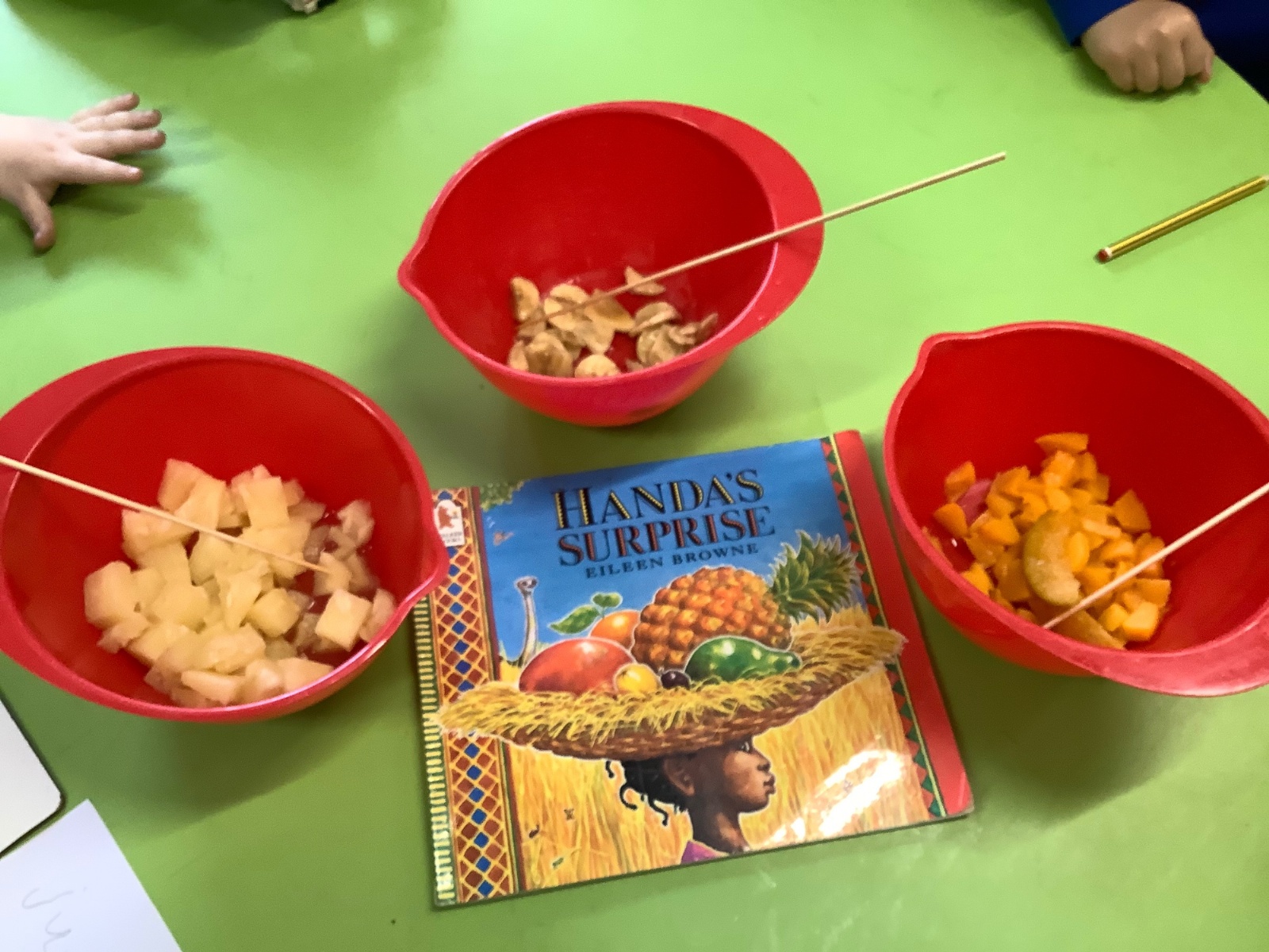 Reception also created their own fruit salad using some of the fruits from the story Handa's Suprise. We did some 'blind taste testing' of the fruits and thought of words to describe them.