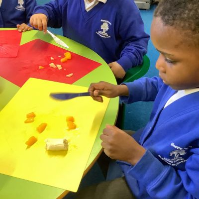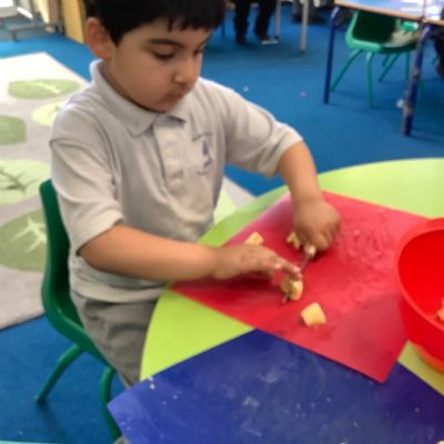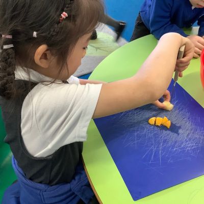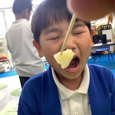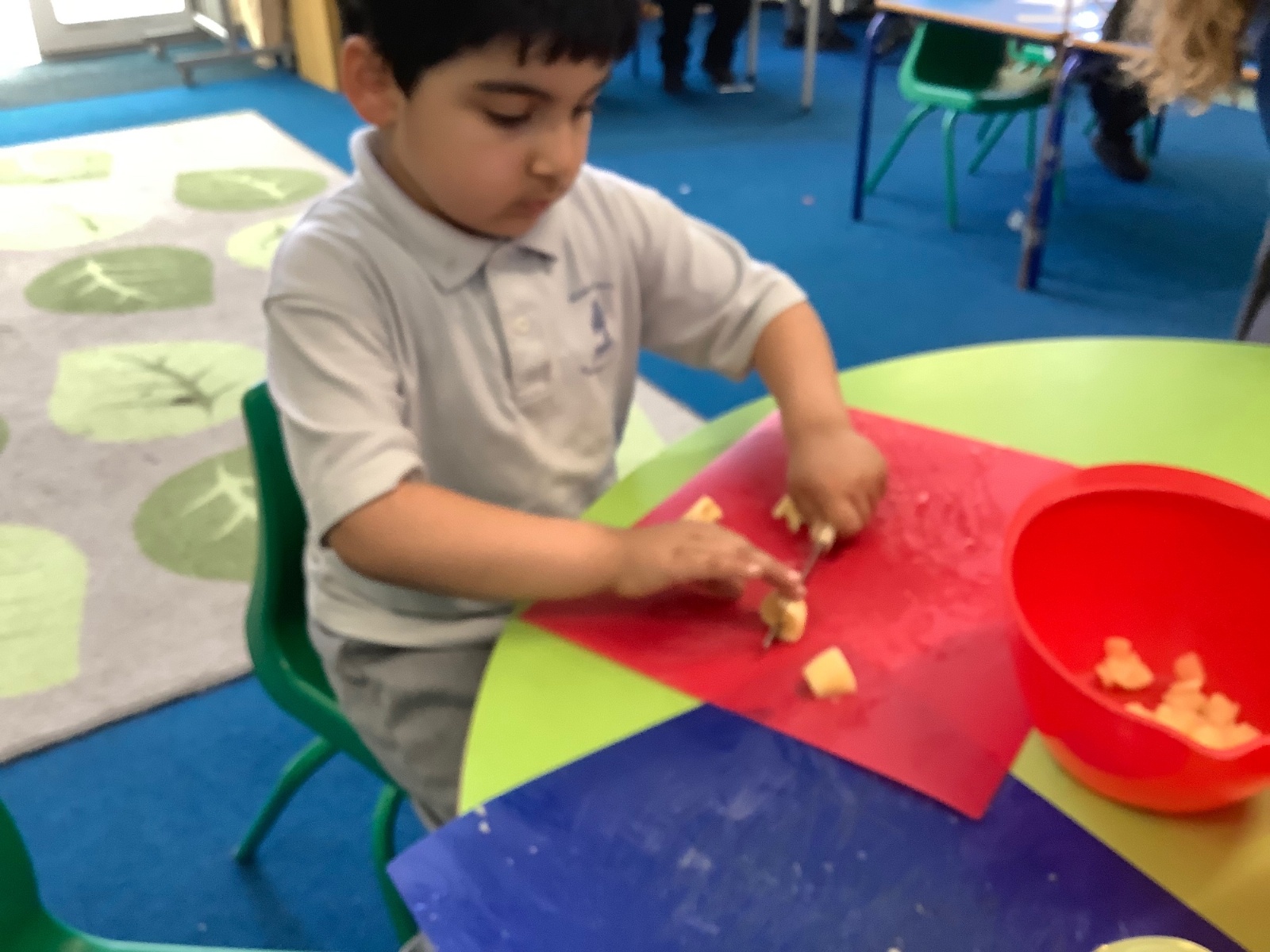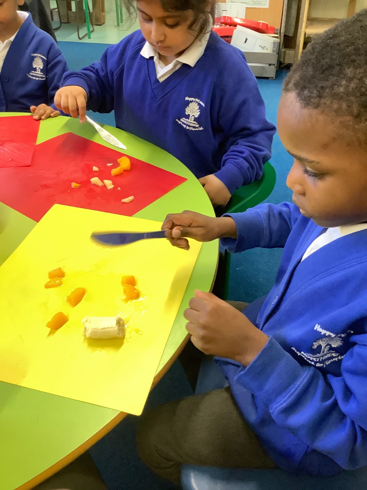 Reception also created their own fruit salad using some of the fruits from the story Handa's Suprise. We did some 'blind taste testing' of the fruits and thought of words to describe them.