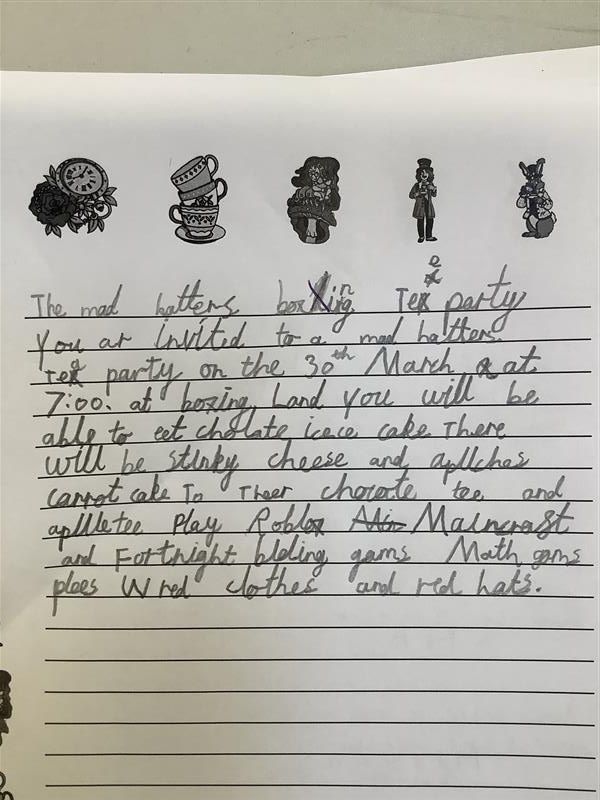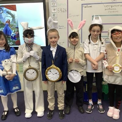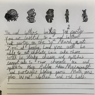 We had a wonderful time celebrating our Alice in Wonderland–themed World Book Day! As well as dressing up, decorating biscuits, reading the story, watching the film, and enjoying a live performance, we also teamed up with Year 4 to write invitations for the Mad Hatter’s Tea Party.